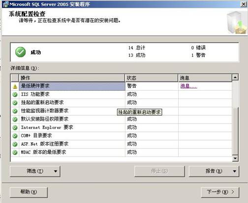 3. 點擊【下一步】,系統(tǒng)開始對系統(tǒng)配置進行檢測,(正常情況有1個警告或者沒有警告,根據(jù)電腦配置而定,這個不影響)。