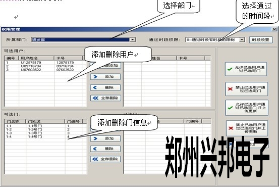 禁止已選用戶通過已選定門:把選擇的用戶的開門權(quán)限從數(shù)據(jù)庫中清除。如果控制器中也存在權(quán)限的話,可以再通過上傳功能將權(quán)限上傳到控制器中。