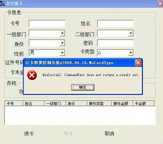 問:485水控機(jī)在發(fā)行新卡的時候提示錯誤 “Qselectall:CommandText does not return a result set.”