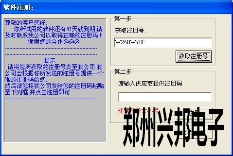 軟件安裝完成后有一個月的試用期,當過了試用期后軟件就打不開了,所以在試用期結束前就要注冊軟件,軟件注冊時首先在軟件的幫助-軟件注冊中獲取一個注冊號,如下圖所示,把獲取到的注冊號發(fā)到公司,公司會提供一個注冊碼,把注冊碼復雜粘貼到第二步的注冊碼中,點擊注冊就可以了。如果軟件已經(jīng)過期獲取不到注冊號,那么就要通過一個小插件獲取注冊號,在插件上進行注冊就可以了。