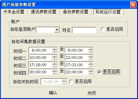 485一卡通軟件可以設(shè)置消費數(shù)據(jù)定時采集,如下圖所示,在用戶高級參數(shù)設(shè)置-系統(tǒng)運(yùn)行設(shè)置中有一個自動采集數(shù)據(jù)設(shè)置,最多可以設(shè)置四個自動采集的時間段,時間段設(shè)置時不能跨天,且后一個時間段的開始時間不能大于前一時間段的結(jié)束時間,設(shè)置完成后勾選上是否啟用,點擊確認(rèn)即可,如果沒有勾選上是否啟用,代表自動采集數(shù)據(jù)設(shè)置不起作用。