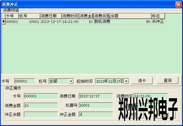 3. 點卡管理--消費沖正,此時把多消費的那張卡放到讀卡器上,然后點讀卡,此時會出現(xiàn)這天這張卡所有的消費記錄,找到消費多扣的那筆記錄,然后雙擊那筆記錄,此時下面就會出現(xiàn)這筆記錄的信息,然后把多消費的金額在沖正金額那輸入即可。(如我這筆消費記錄應(yīng)該是8元,但是按錯了按成10元,此時我可以沖正2元)