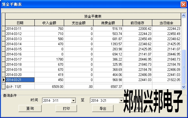 485軟件中資金平衡表是查詢(xún)指定日期的賬目情況,包括收入、支出、消費(fèi)和結(jié)余,統(tǒng)計(jì)時(shí)是按天統(tǒng)計(jì)的,顯示時(shí)也是按天顯示,一天一行,每一天都一個(gè)結(jié)存,當(dāng)日結(jié)余=收入金額-支出金額-消費(fèi)金額+前日結(jié)存,收入是指出納員每天的存款、收取的卡本金等,支出是指取款、退還卡本金、收繳舊卡的退款等,消費(fèi)金額是指每天的消費(fèi)總額,前日結(jié)存是指前一天的結(jié)余,每天的賬都是互相關(guān)聯(lián)的,若有一天的賬目不對(duì),會(huì)影響到以后的所有賬目,所以在結(jié)賬前要求必須將所有消費(fèi)數(shù)據(jù)都采集完畢。