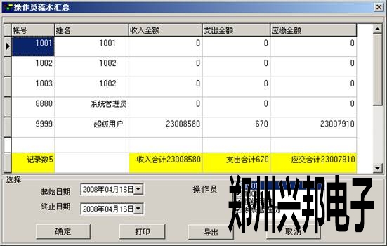 此表用于查詢出每個(gè)操作員某個(gè)時(shí)間段的的收入,支出金額及所應(yīng)上繳的總金額。