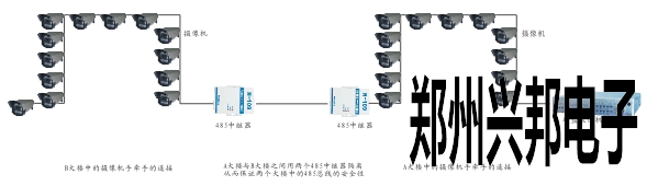 施工方采用485中繼器解決上述問題。在A,B教學(xué)樓里面各放一個485中繼器,等于把一個485網(wǎng)絡(luò)分成了3485網(wǎng)絡(luò),這樣485網(wǎng)絡(luò)就可以很穩(wěn)定的運行。再由于教學(xué)樓之間的200m的距離是在兩個485中繼器中間,即使有強電干擾,由于485中繼器中防雷保護和光隔離功能,也會被其所吸收,隔離。從而保證了485網(wǎng)絡(luò)的穩(wěn)定性及安全性。