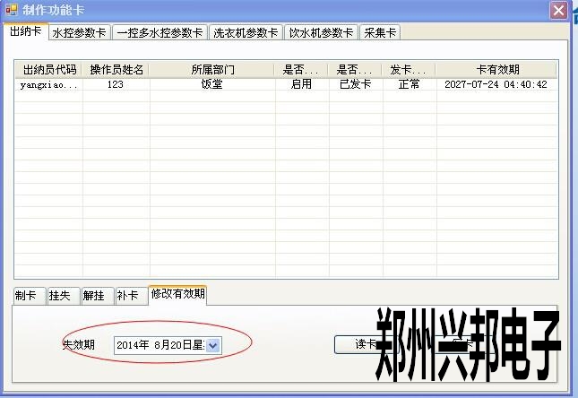 [文章內(nèi)容簡介]:IC卡食堂售飯機一卡通軟件,客戶在用一段時間后,再用出納員登錄,提示出納卡己過有效期。在出納卡這個界面你可以進行制卡,掛失,解掛,補辦出納卡和修改出納卡的有效期