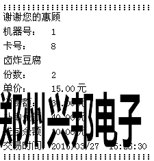 計算模式下按‘+’號鍵可進行取餐,取餐時將需要取餐的卡放到刷卡區(qū),消費機可自動讀取卡片上的訂餐信息,并將其顯示出來,按‘+’號鍵可翻頁查看訂餐信息,按‘確認’可進行取餐,取餐成功后會顯示就餐成功、菜肴名稱、份數(shù)、扣費金額,若連接的有打印機,可打印取餐信息,打印的格式如下圖所示: