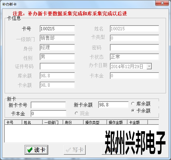 注: 收繳舊卡是卡片不再使用將卡片收回的操作,進(jìn)行讀卡,卡庫(kù)一致的情況下就可進(jìn)行寫(xiě)卡,退還卡余額完成操作。收繳回來(lái)的卡可以重新發(fā)行。