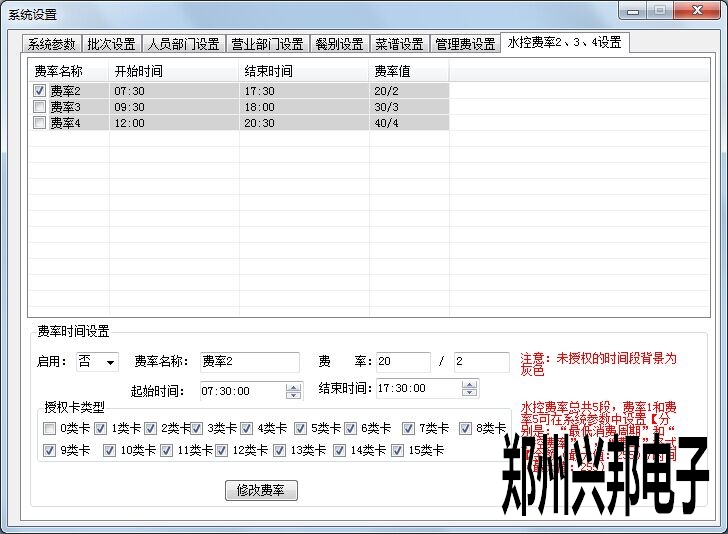 互聯(lián)網(wǎng)平臺IC卡水控機(jī)具備多費(fèi)率扣費(fèi)功能,不同卡類型的卡片可以按不同的費(fèi)率扣費(fèi),甚至免費(fèi)使用,費(fèi)率最多可以設(shè)置5個(gè)費(fèi)率,分別是費(fèi)率1(最低消費(fèi)周期,分卡類型)、費(fèi)率2(時(shí)間段費(fèi)率,分卡類型)、費(fèi)率3(時(shí)間段費(fèi)率,分卡類型)、費(fèi)率4(時(shí)間段費(fèi)率,分卡類型)、費(fèi)率5(不分卡類型),該設(shè)置可以通過制作管理卡或者下載系統(tǒng)參數(shù)下載到水控機(jī)中。
