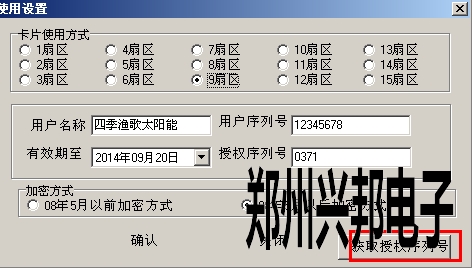 2.雙擊后出現(xiàn)下圖所示的界面,點(diǎn)擊該界面右下角的【獲取授權(quán)序列號(hào)】按鈕,即可讀出當(dāng)前數(shù)據(jù)庫(kù)中的設(shè)置,包括 使用扇區(qū)、用戶(hù)名稱(chēng)、用戶(hù)序列號(hào)、授權(quán)序列號(hào)、加密方式
