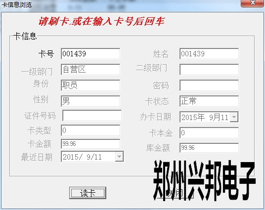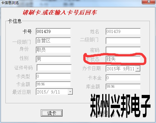 卡片就上面三種狀態(tài),另外一些操作,會造成卡狀態(tài)改變,比如:掛失的卡解掛,就變成消費卡;掛失的卡補辦新卡,掛失卡就會變成新卡;消費卡被收繳舊卡就變成新卡。新卡在消費機上刷卡會顯示1-Err,消費卡會顯示金額,掛失卡會顯示4-Err