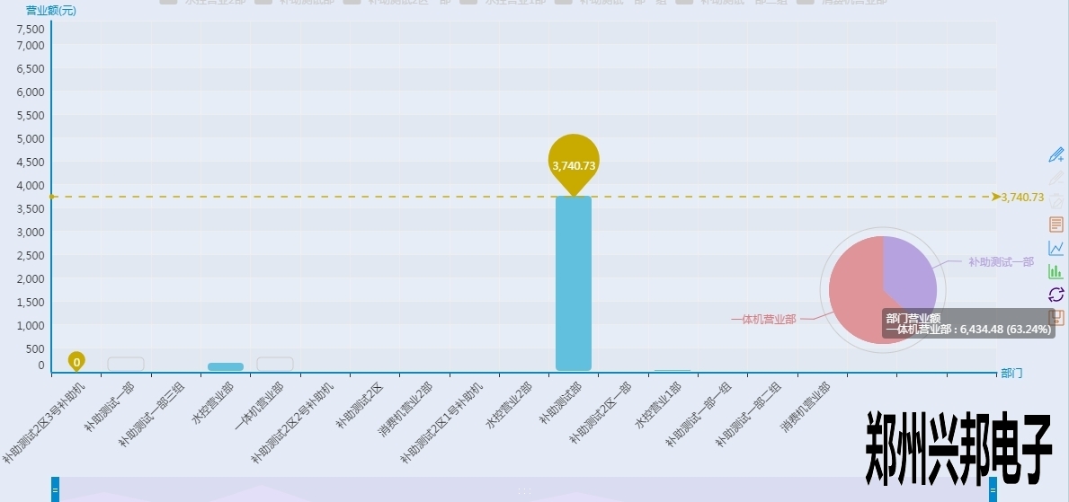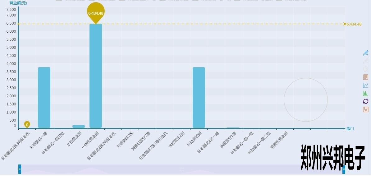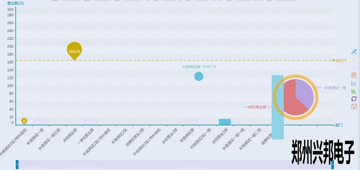 看上起跟終端營(yíng)業(yè)圖表差不多,但是有沒(méi)有注意到有一根和終端營(yíng)業(yè)分析圖不一樣樣色的虛線(xiàn)?這是這個(gè)圖表里面的最大值,也就是營(yíng)業(yè)額最高的部門(mén),當(dāng)然下面的工具條也可以像終端營(yíng)業(yè)分析圖一樣的滑動(dòng)來(lái)看某個(gè)具體的柱圖,不過(guò)你又沒(méi)有注意到后面還有一個(gè)圈?對(duì)那是一個(gè)圈圈,有什么用呢?來(lái)看一下下面的圖形: