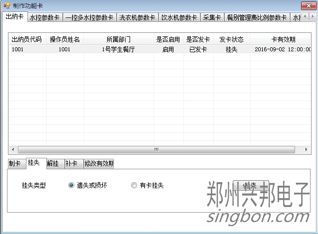 客戶使用的我們的互聯(lián)網(wǎng)一卡通食堂售飯機(jī)軟件,不小心把出納卡制成員工卡使用了,遇到這種情況,(1)用超級(jí)管理員身份登錄軟件,在軟件的制卡中心-功能卡制作-出納卡頁(yè)面里選中之前的出納員信息,選擇掛失(掛失類型選擇遺失或損壞),點(diǎn)擊右邊的掛失把原來(lái)的出納員賬號(hào)掛失;
