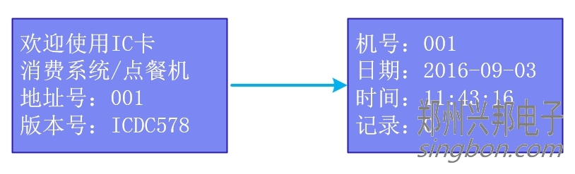 將消費機插上12V電源,開機時顯示版本號和機器號,最后轉(zhuǎn)入待機界面,顯示機器號、日期、時間界面。