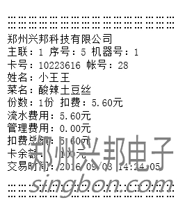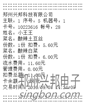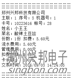 3) 自動消費模式:最多可設(shè)置8個費率,每個費率可設(shè)置對應(yīng)的菜肴、份數(shù),將費率設(shè)置好之后在自動模式下輸入相應(yīng)的費率編號放卡即可自動扣除相應(yīng)費用。只有計算和自動模式可以用,計算模式只作為查看使用,不能扣費。若連接的有打印機,可打印消費明細,打印出來的消費明細格式如下圖所示: