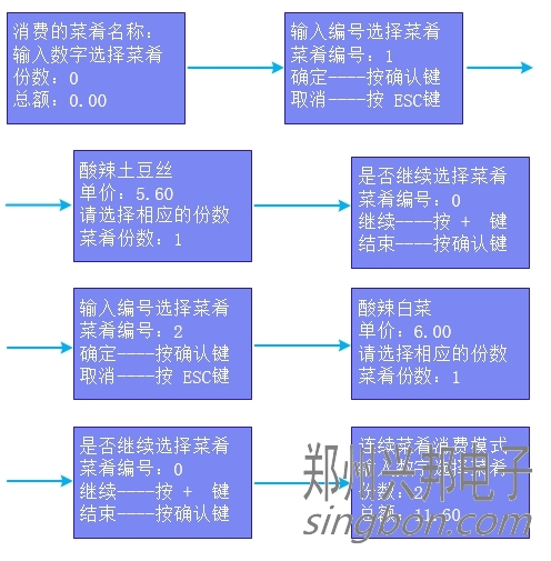 ③ 連續(xù)菜肴消費模式:輸入菜肴編號,點擊確認后選擇份數(shù),點擊確認后出現(xiàn)“是否繼續(xù)選擇菜肴,菜肴編號:0,繼續(xù)----按 +  鍵,結(jié)束----按確認鍵”,點擊“+”號,輸入下一份菜肴編號,點擊確認后選擇份數(shù),點擊確認后出現(xiàn)是“是否繼續(xù)選擇菜肴,菜肴編號:0,繼續(xù)----按 +  鍵,結(jié)束----按確認鍵”,點擊確認,出現(xiàn)消費的份數(shù)、總額,將卡片放于刷卡區(qū),即可進行扣費,扣費后顯示扣費金額、手續(xù)費用、卡上余額、卡號,操作流程如下圖所示: