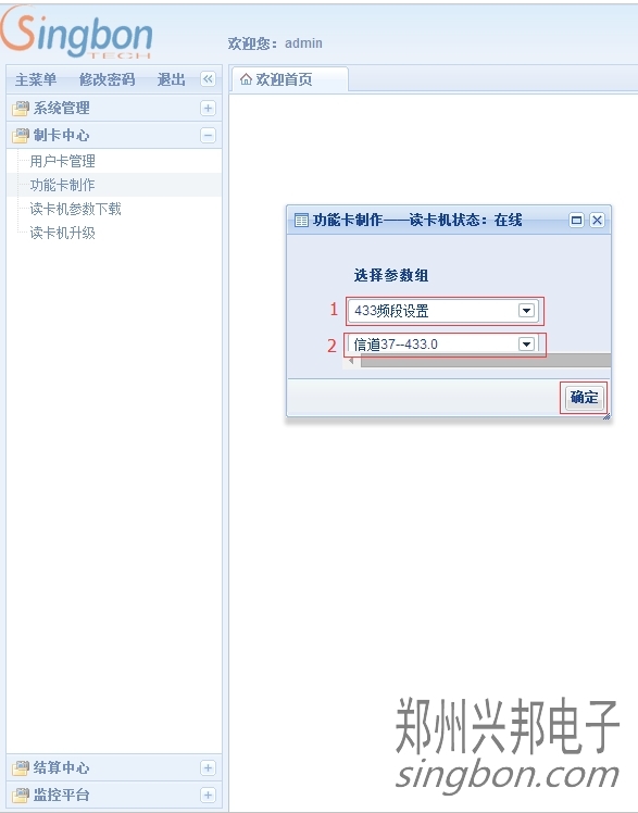 在上圖中,方框1處參數(shù)組選擇“433頻段設(shè)置”,方框2處是供用戶選擇的信道,用戶選擇好需要使用的信道后,在綁定的讀卡機(jī)上放一張相同參數(shù)未發(fā)行的卡片,點擊“確定”按鈕后功能卡制作成功。用制作好的功能卡在機(jī)器的刷卡處刷卡,從而修改機(jī)器的信道。