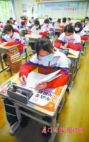 廈門網(wǎng)訊(廈門晚報記者郭文娟林珊吳笛圖/劉東華)今天早上,全市近1.6萬名高三學(xué)生重返課堂。距離高考只有三個月了,老師勉勵學(xué)子們:“寧吃百日苦,不留終生憾!”校園里張貼的紅色標語,也為學(xué)生們加油鼓勁:“努力到無能為力,拼搏到感動自己!”